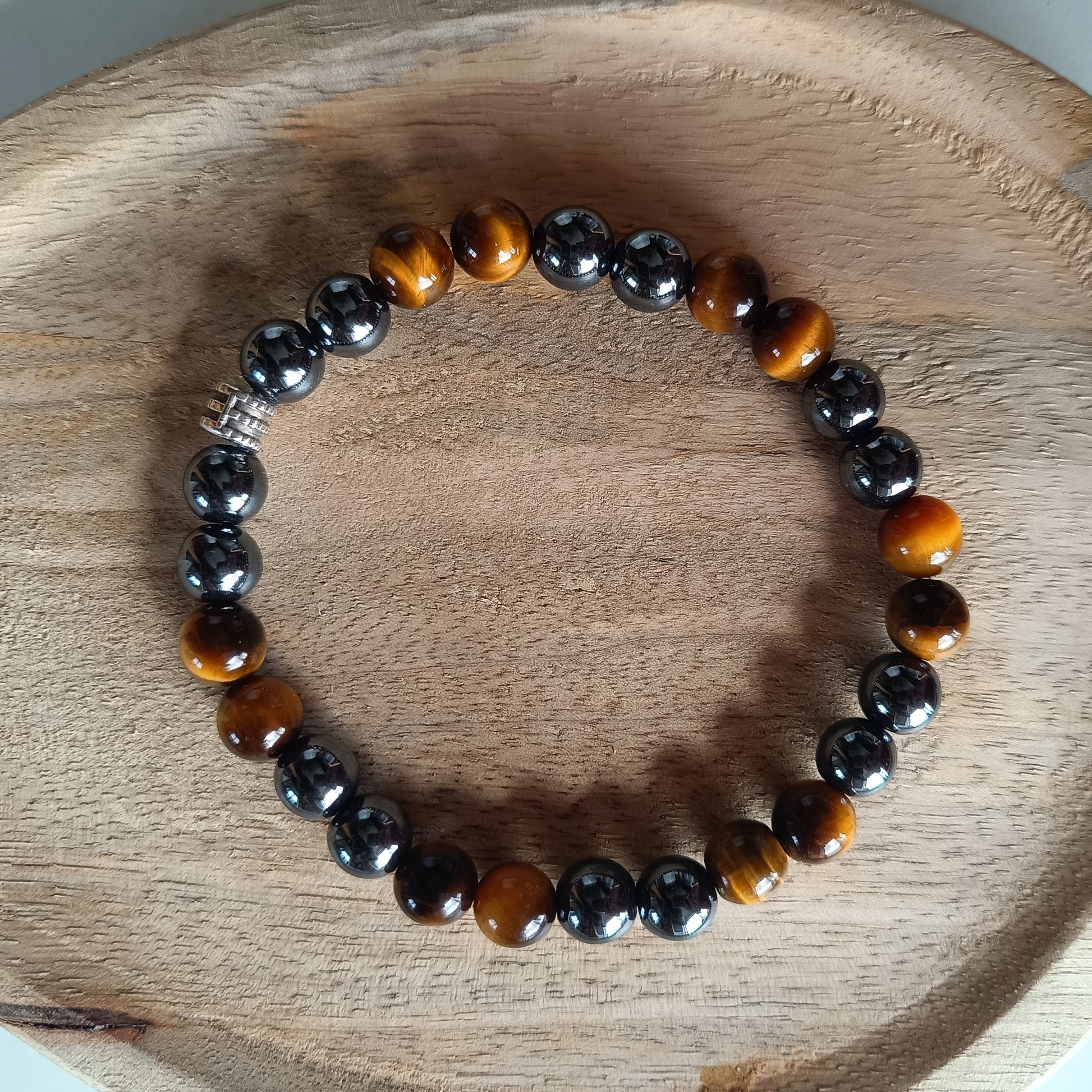 Le bracelet Vincent allie la puissance d'ancrage et les vertus protectrices de l'hématite, qui favorise également la confiance en soi et la vitalité, à l'œil de tigre, pierre réputée pour offrir une protection contre le mauvais œil et la magie noire et pour stimuler le courage.