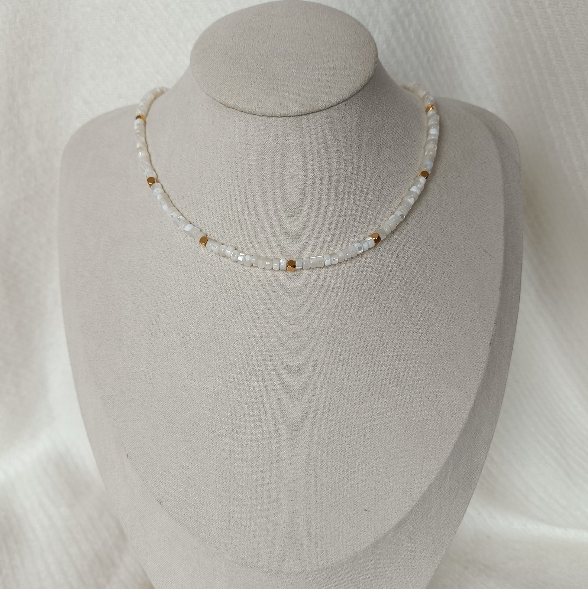 Ce collier ras de cou Nacre, aux tons blanc et doré, est idéal pour créer des superpositions élégantes. Sobre et raffiné, il s’harmonise facilement avec toutes vos tenues, apportant une touche délicate et lumineuse à votre style quotidien.